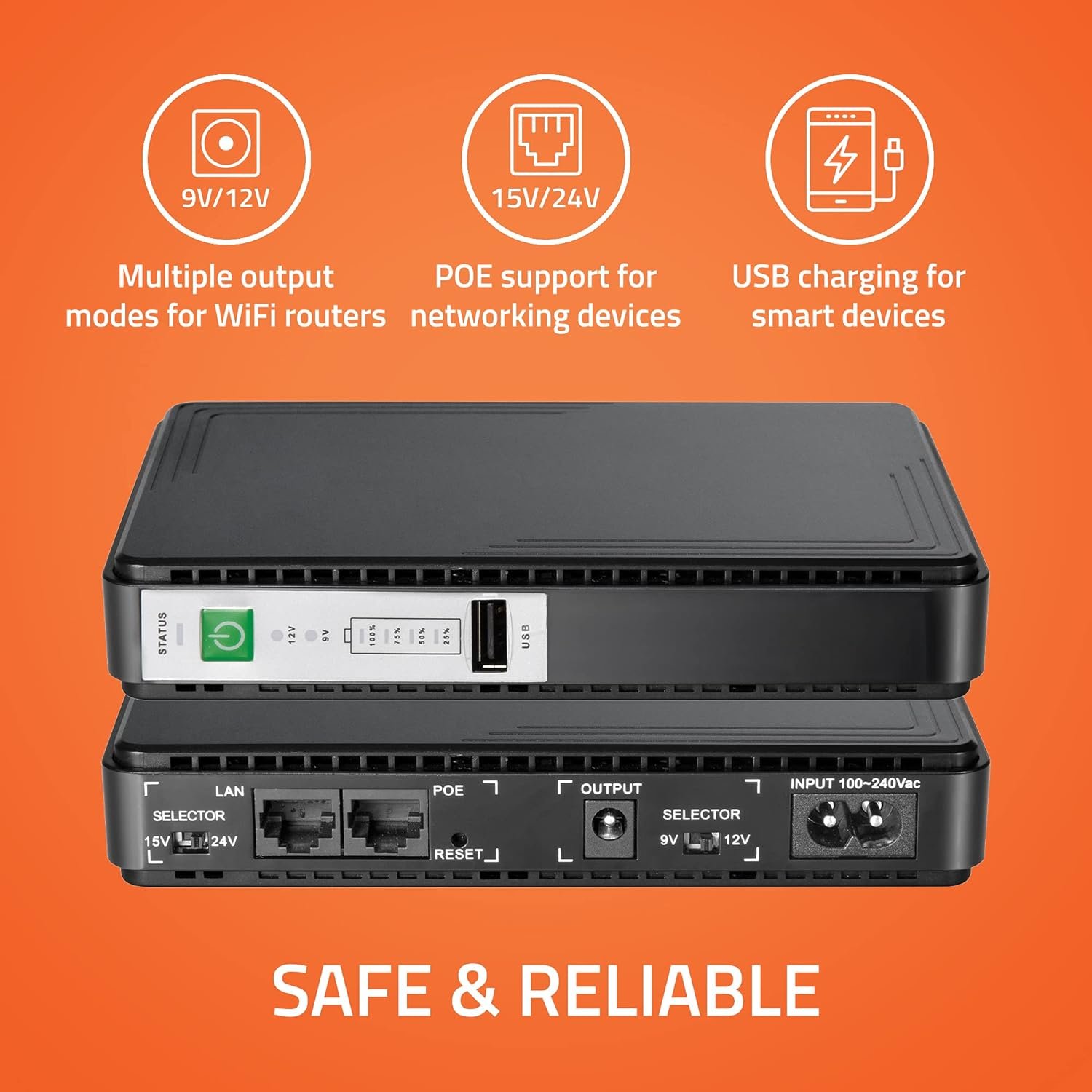 • Compact & Lightweight Mini UPS with battery level indicator, 8800mah battery & upto 8 hours backup for Wifi Routers, Modems, DTH Set Top Boxes & USB Smartphone Charging. Router support: 9V/12V-1A/1.5A/2A. POE Support: 15V/24V. USB Output: 1.7A Max.