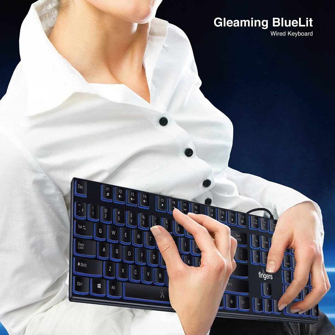 FINGERS Gleaming BlueLit Wired Backlit Keyboard – Spill Resistant, 3 Levels of Brightness, Compatible with Windows®, Mac, Linux