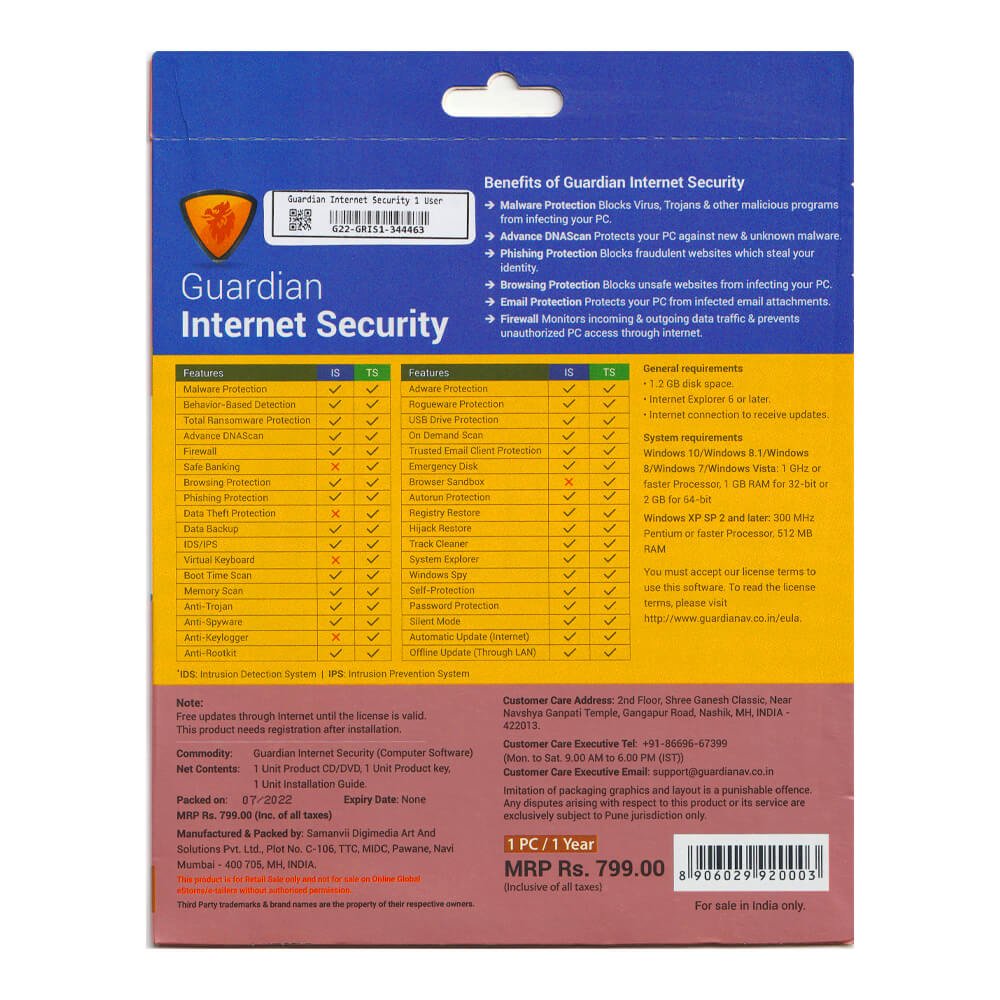 Guardian Internet Security Antivirus 1 User 1 Year guarantees peace of mind with its user-friendly interface and efficient performance. It offers real-time protection, automatic updates, and safe browsing, preventing unauthorized access and securing online transactions.