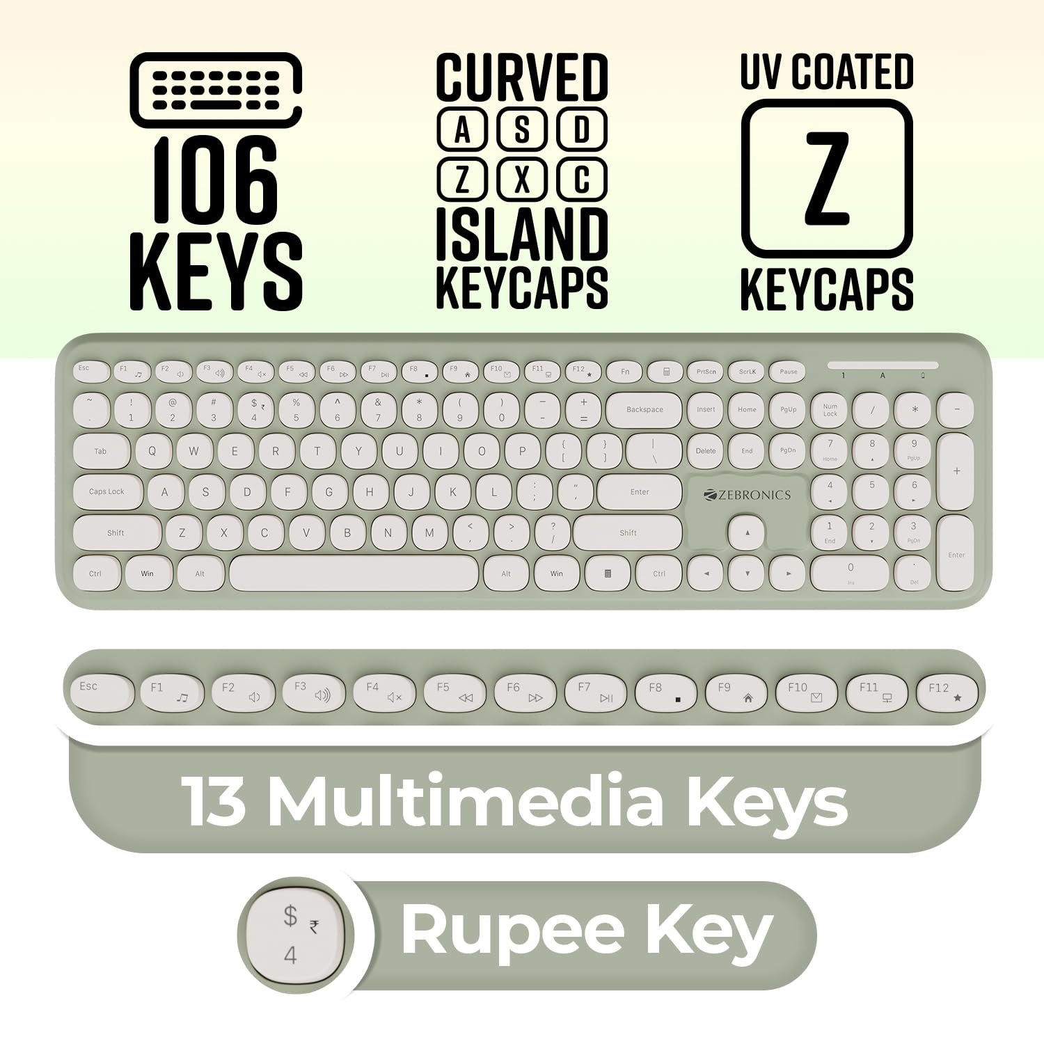 ZEBRONICS Companion 302 Wireless Keyboard & Mouse Combo – UV Printed Keys, Multimedia Keys (Green)