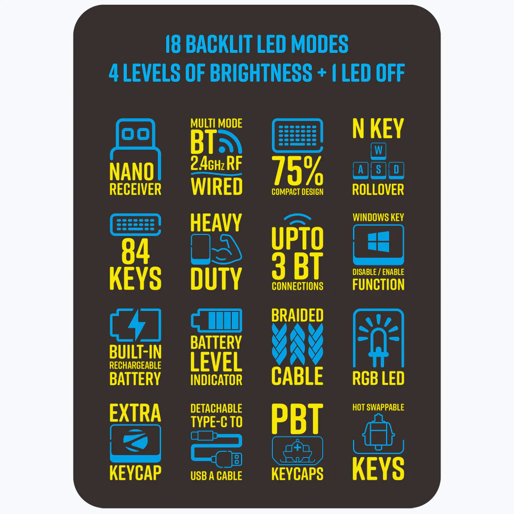 • RGB Backlit keycaps | PBT material keycap | 18 RGB LED modes | Brightness & LED speed modes.
