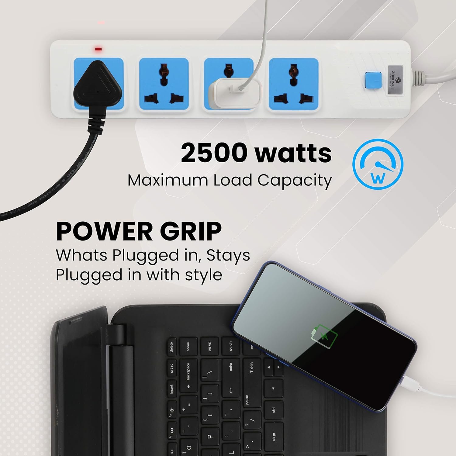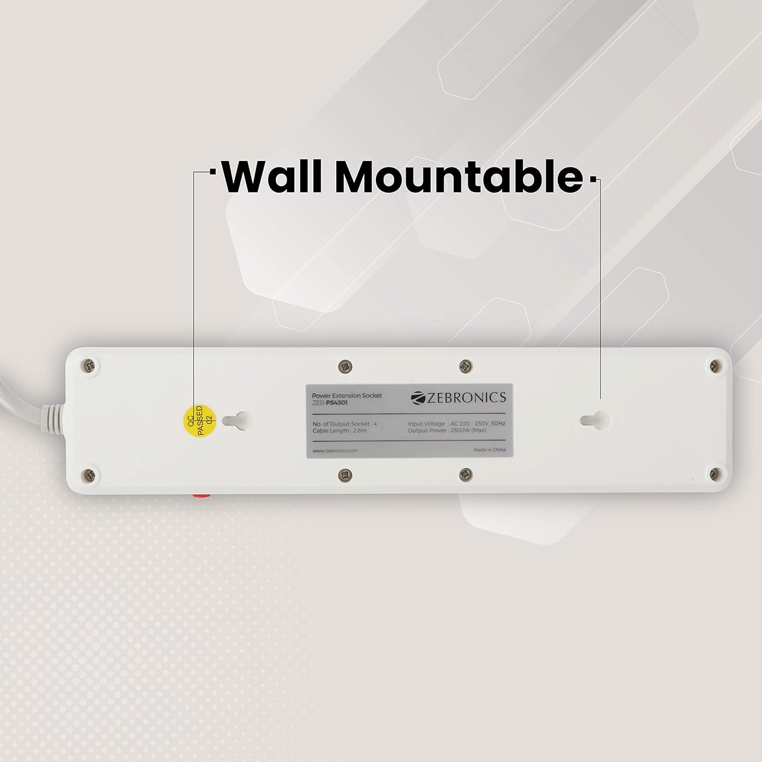 Zebronics PS4301 2500W Power Extension Spike Socket with 4 Universal Sockets, 250V (White)